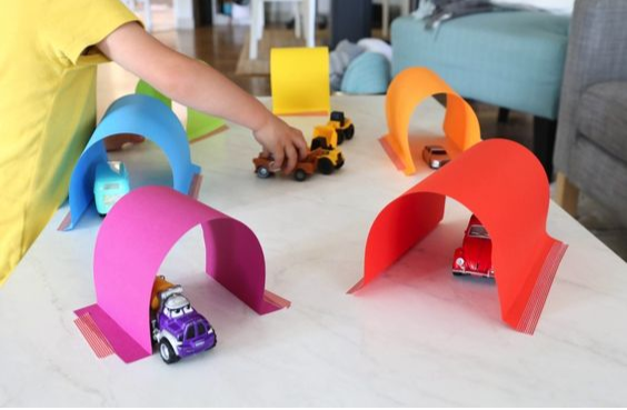 • Maak een ‘racebaan’ voor auto’s en laat je kleuter met een auto tussen de lijnen rijden.