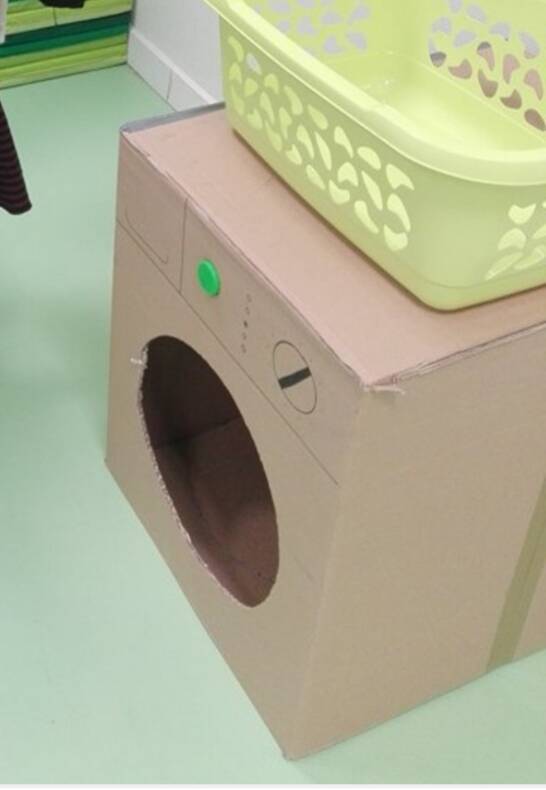 - Maak van een kartonnen doos een wasmachine. Laat je kleuter nu 'wasjes' draaien in de wasmachine. Goed ronddraaien hé, dan is je doekje of je knuffel helemaal proper! Probeer ook met je andere hand!